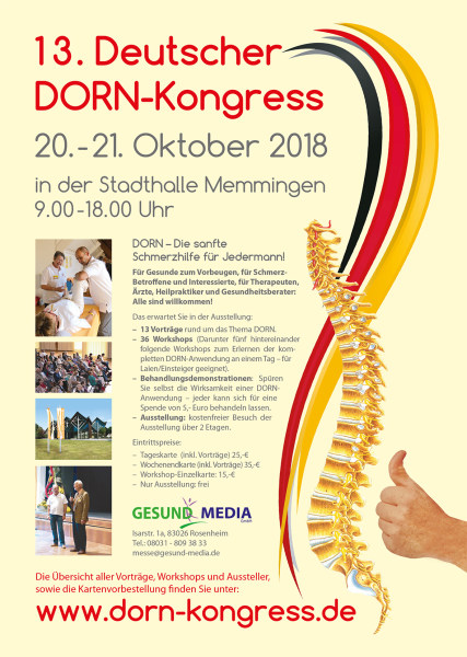 Auch Sie können den DORN-Kongress auf einfache Art und Weise unterstützen. Gerne senden wir Ihnen Werbematerialien wie Programmhefte, Planen oder Aufkleber zu. Diese können Sie auslegen, verteilen oder verschicken. Umgekehrt hinterlassen die Werbemaßnahmen einen seriösen und professionellen Eindruck bei Ihren Patienten und Kunden. Natürlich erhalten Sie die Werbemittel kostenfrei von der Gesund Media GmbH.